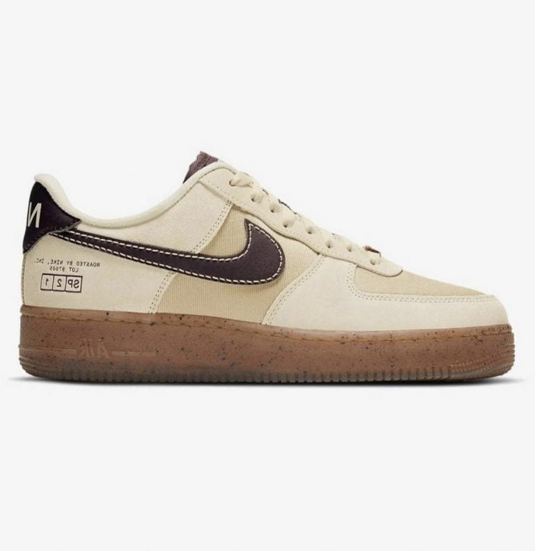 The Air Force 1 ‘Coffee’ features a beige upper made from different materials. Namely, a smooth suede on the overlays and a denim-like fabric on the toebox and sides of the trainer. The Swoosh is made of leather and has been given a dark brown colour. The dark brown leather also extends to the backtab.